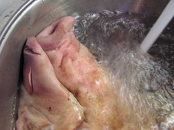 A lepörzsölt szõrt kaparjuk le késsel, és jól mossuk le a fejet. Vegyük elõ a kurva nagy lábosunkat (50 literes legalább!!!), és addig eresszük a vizet, amíg el nem lepi disznónk fejét. Hogy levegõt kapjon, orrlikát kint hagyhatjuk.