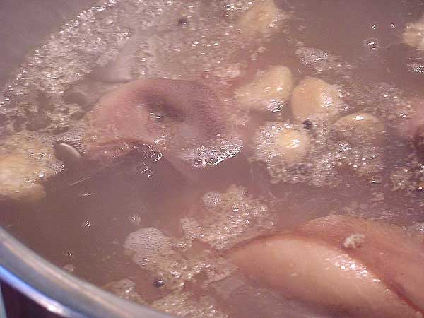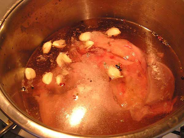 A vízbe tegyünk sok sót, 6-7 lapos evõkanál simán mehet bele. Egy fél maréknyi egész borsot szórjunk bele, és dobáljuk bele a fokhagymát (2-3 fejet gerezdben).