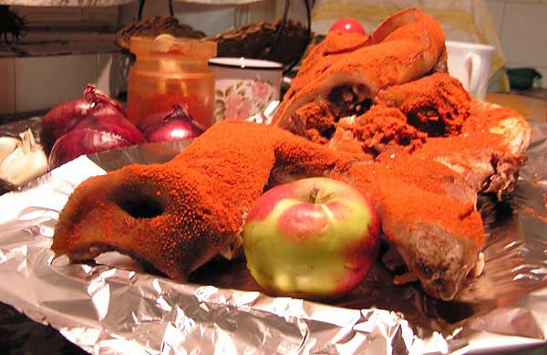 Ha a fej már olyan puha, hogy lecsúszik a csontról, kivehetjük. A levet még véletlenül se öntsük ki, hiszen kocsonyához a legkiválóbb alaplé. Kis vízzel (0,5 deci) 2-3 gerezd fokhagymát turmixoljunk össze, rakjunk hozzá sót, és kenjük be vele a disznó pofáját. Ha ez megvan, édes pirospaprikával bõven szórjuk meg. Hagyjuk kihûlni, mert kész van.